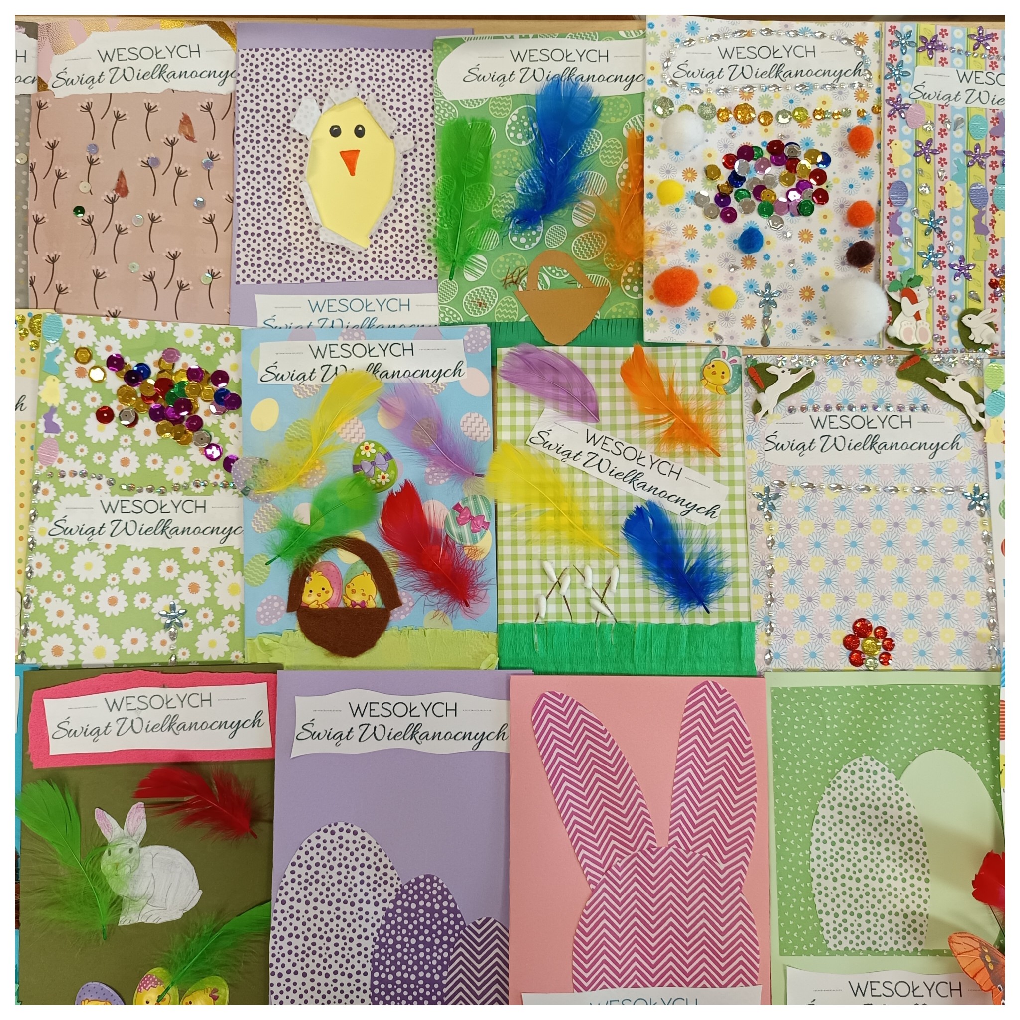 Kreatywne kartki wielkanocne wykonane przez uczniów z klas 4-7 na lekcjach plastyki. Już niedługo…. za chwileczkę…
